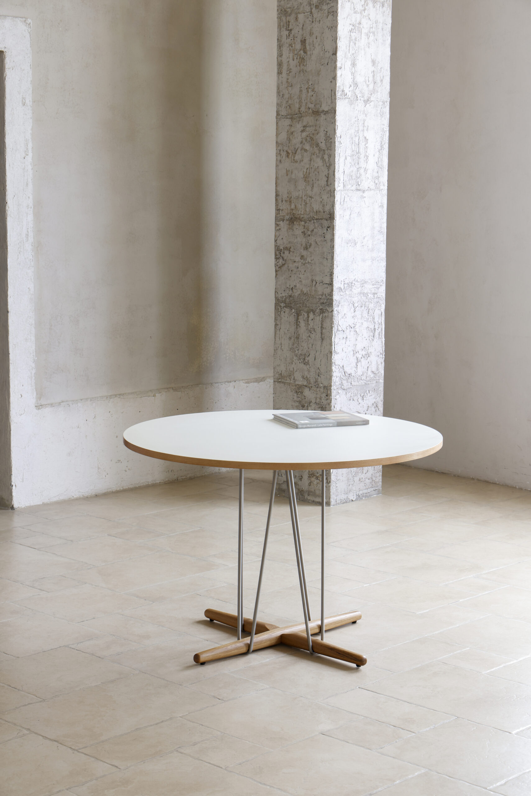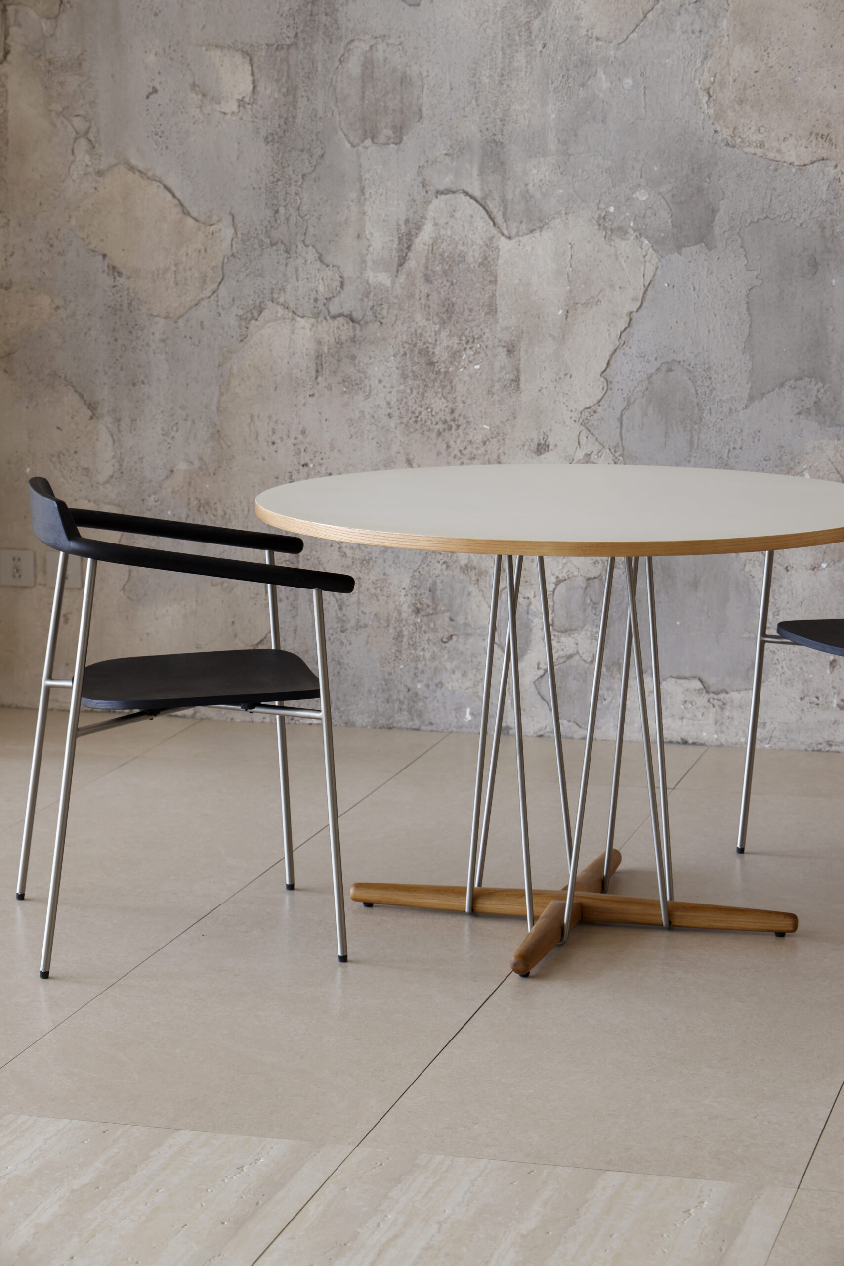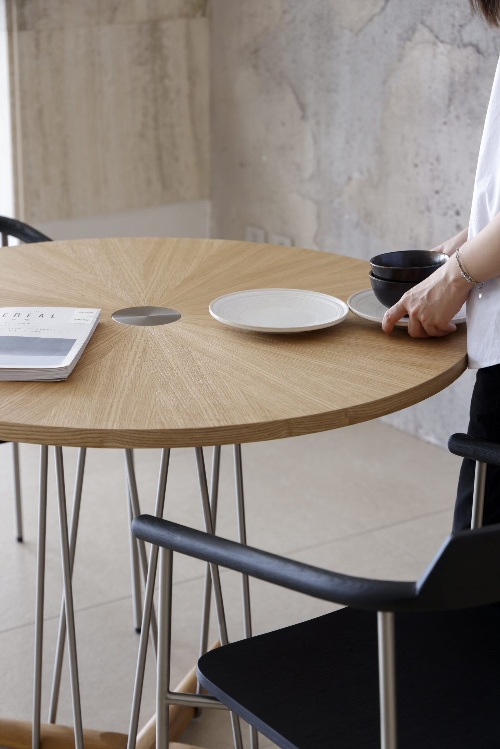A minimalist designer round dining table that celebrates clean lines and lightness. With a wide range of table top options, from classic wood inlays to tactile high-pressure laminates, it adapts easily to different interior styles. The slim stainless steel frame provides strong support while creating a floating table top effect for a refined, modern look.