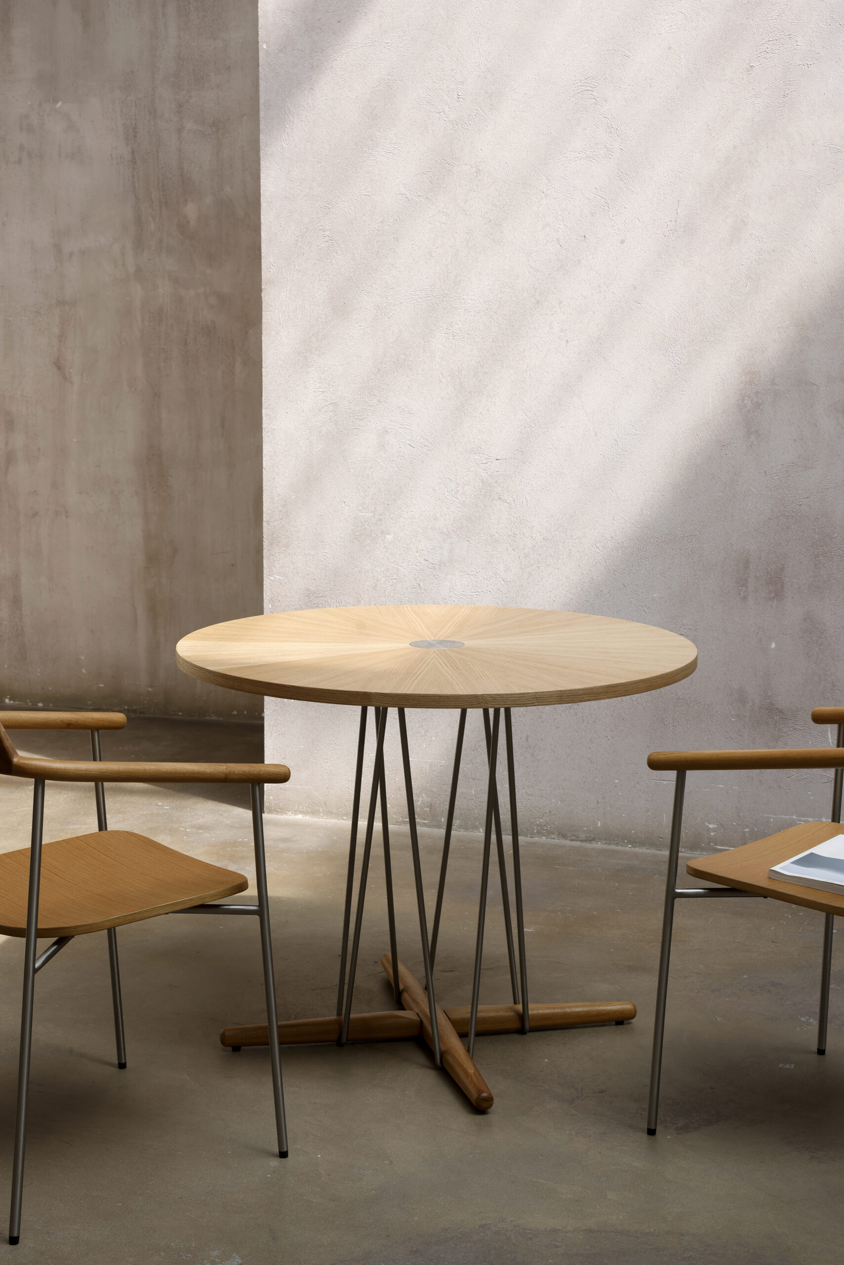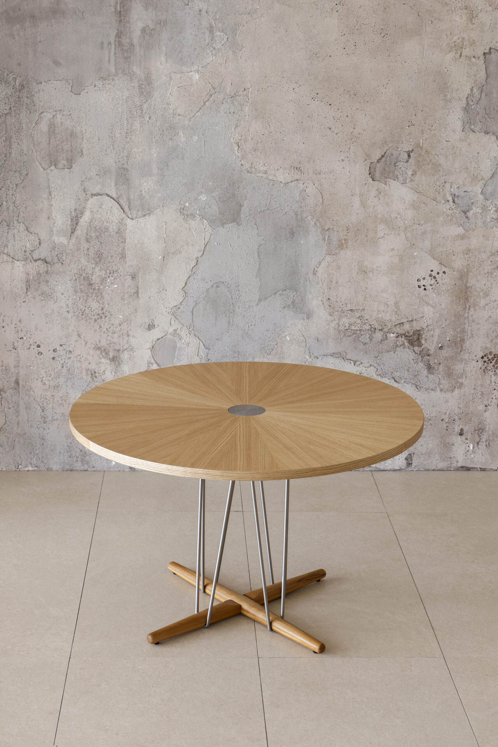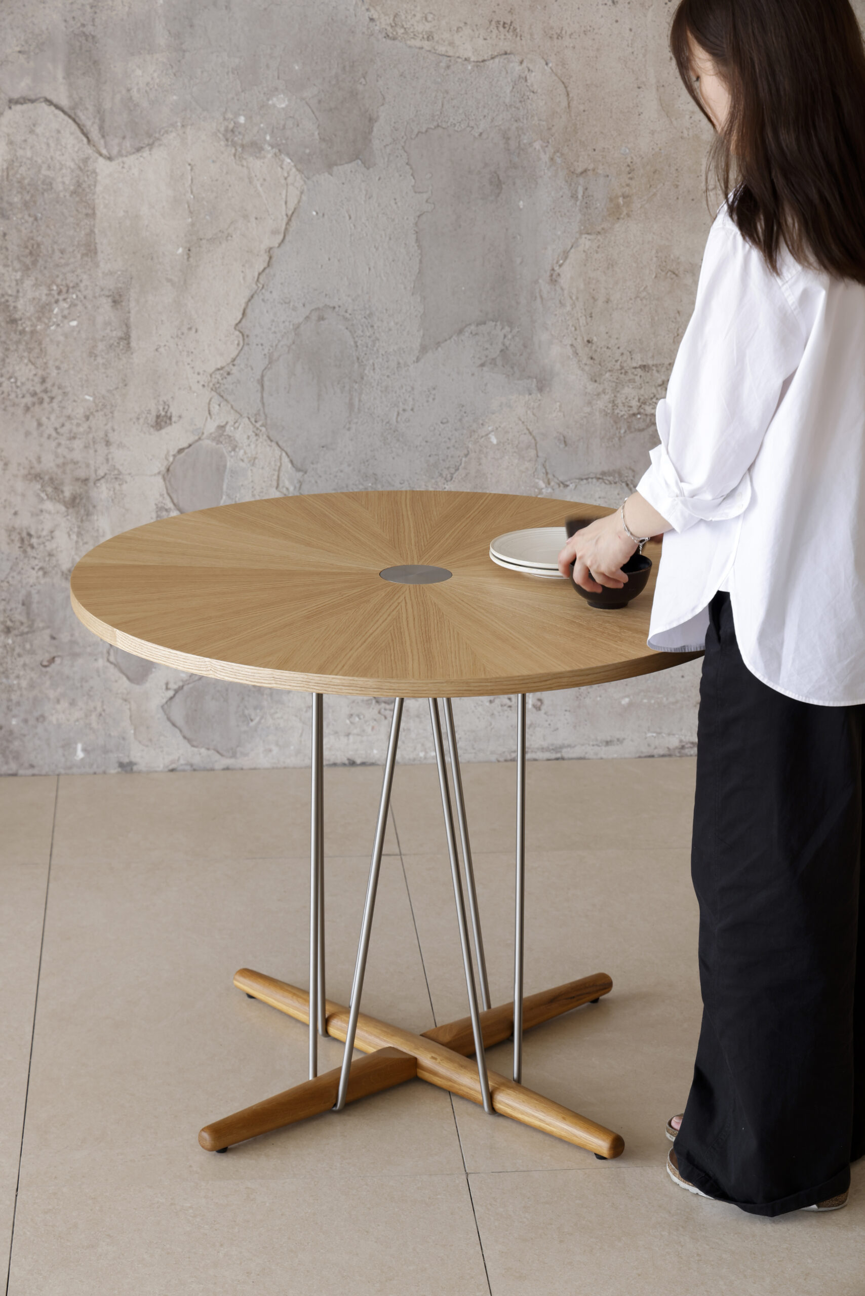 A minimalist designer round dining table that celebrates clean lines and lightness. With a wide range of table top options, from classic wood inlays to tactile high-pressure laminates, it adapts easily to different interior styles. The slim stainless steel frame provides strong support while creating a floating table top effect for a refined, modern look.