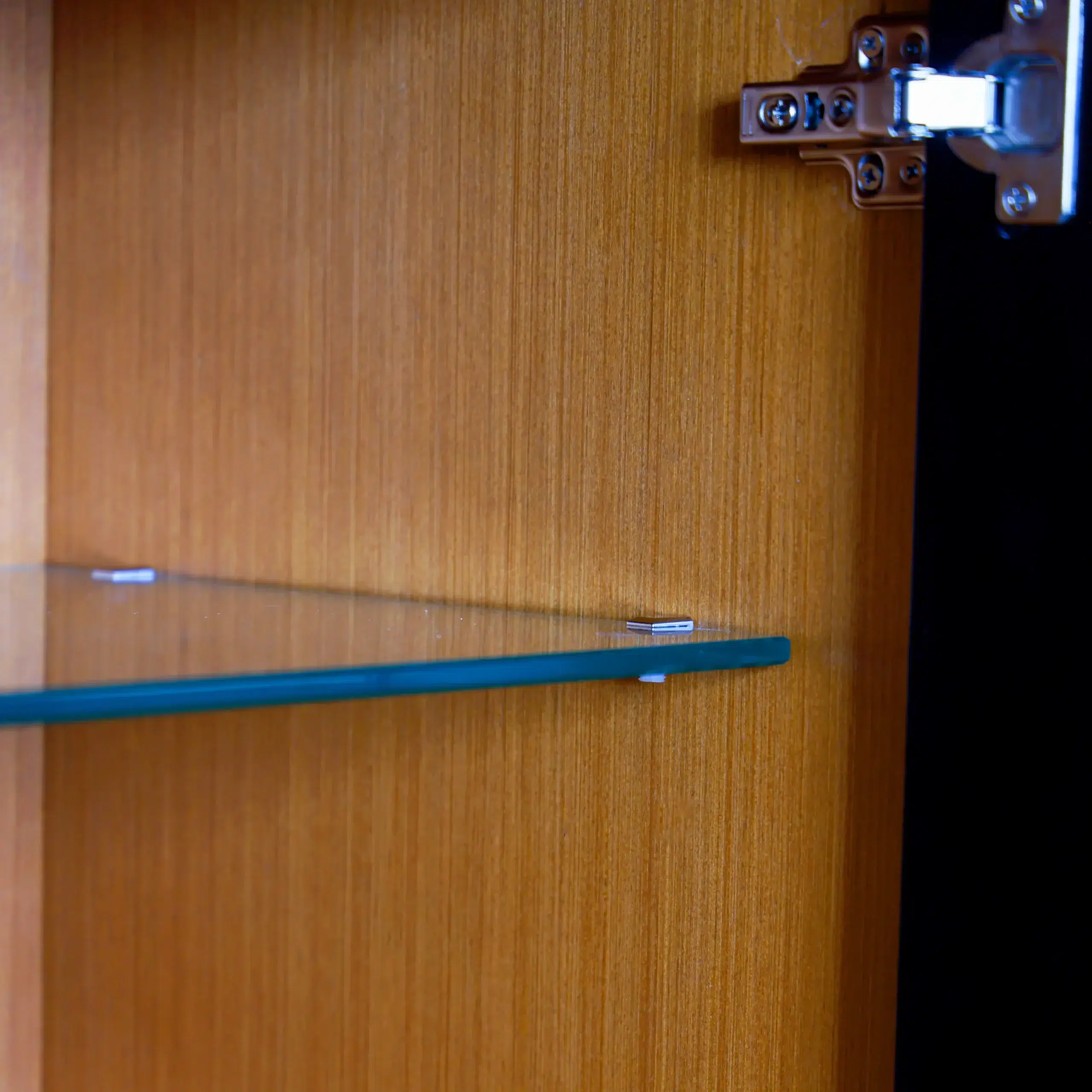 The Elly Cabinet 2.0 is an updated version of the original storage design. This new model replaces the previous black veneer with warm teak engineered veneer. Black accents and stainless steel trim add contrast and a refined silver detail. Together, these materials create a fresh, contemporary look.