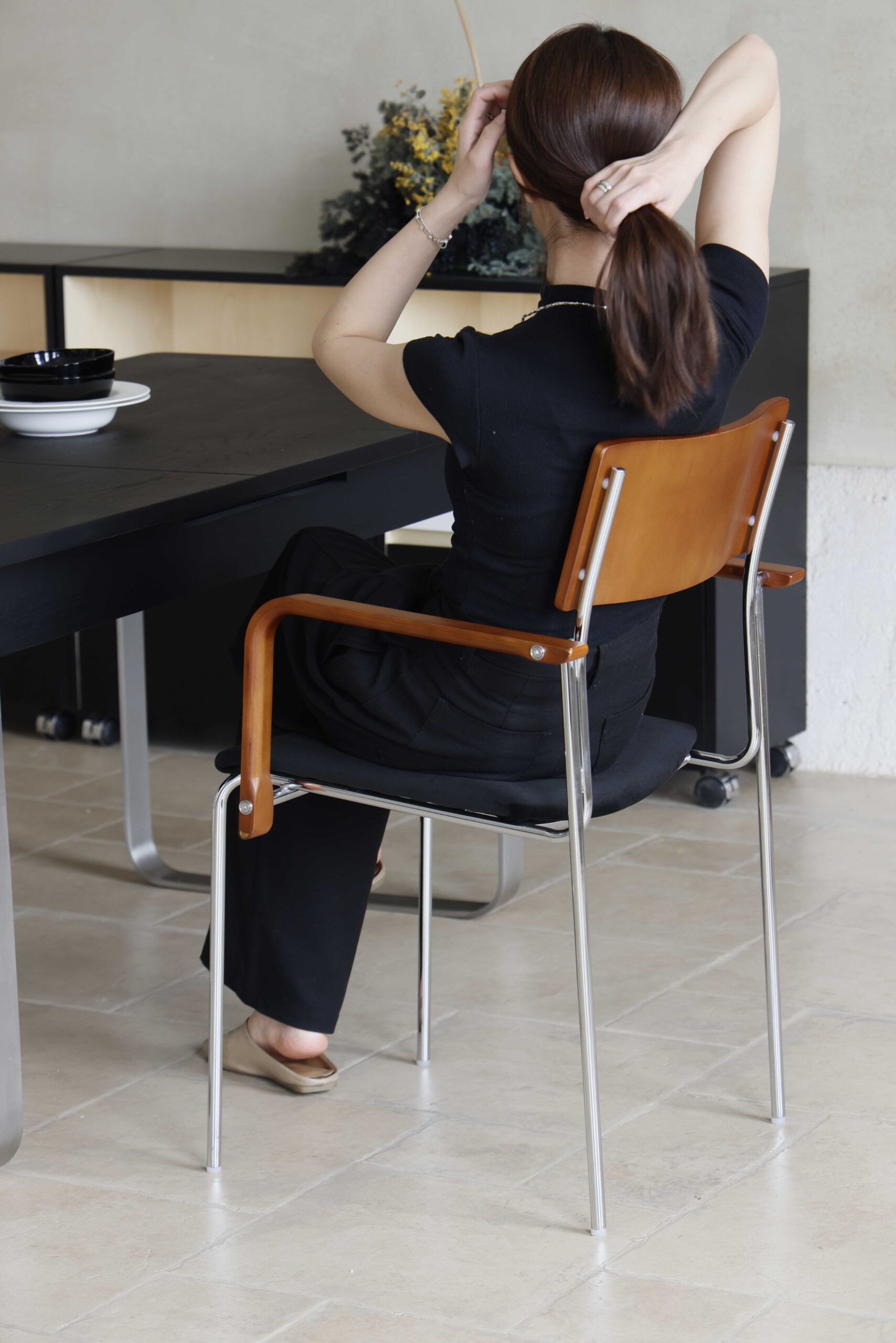 Both the backrest and seat follow an ergonomic curvature that supports natural posture, offering comfort through longer meals or relaxed gatherings. The combination of refined metal, sculpted timber and thoughtful contours makes this modern dining chair an ideal choice for anyone seeking a sophisticated, design forward piece for their dining space.