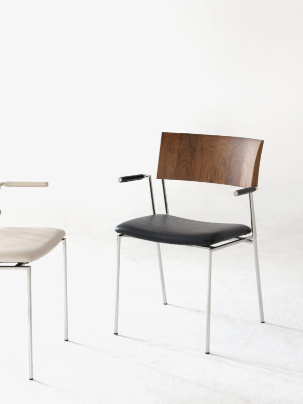 A refined designer dining chair inspired by mid century aesthetics, combining electroplated metal in a silver finish with beautifully curved multi layer solid wood. Finished with beech veneer, the ergonomic backrest and seat offer supportive, comfortable dining. A stylish blend of Bauhaus influence and modern Australian taste.