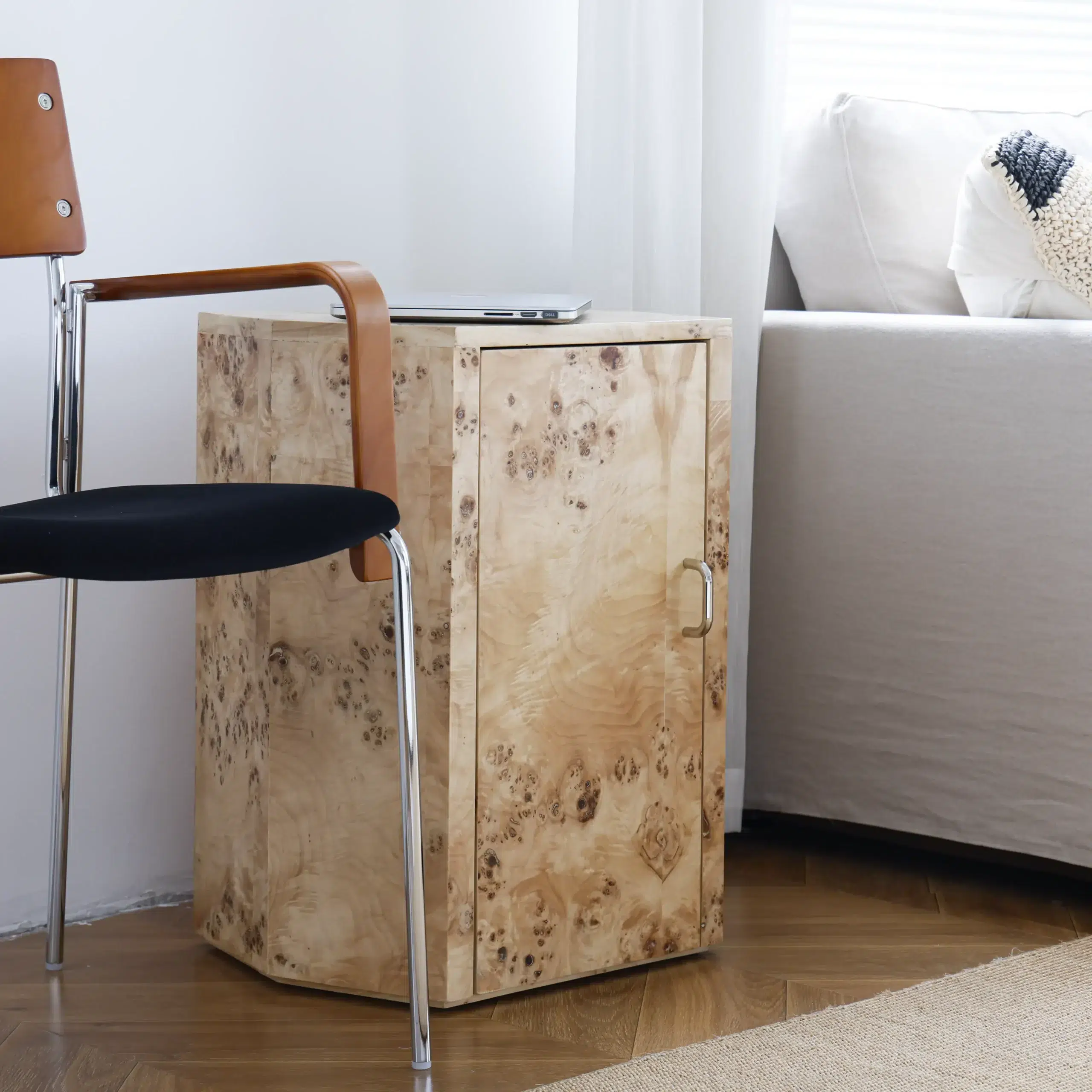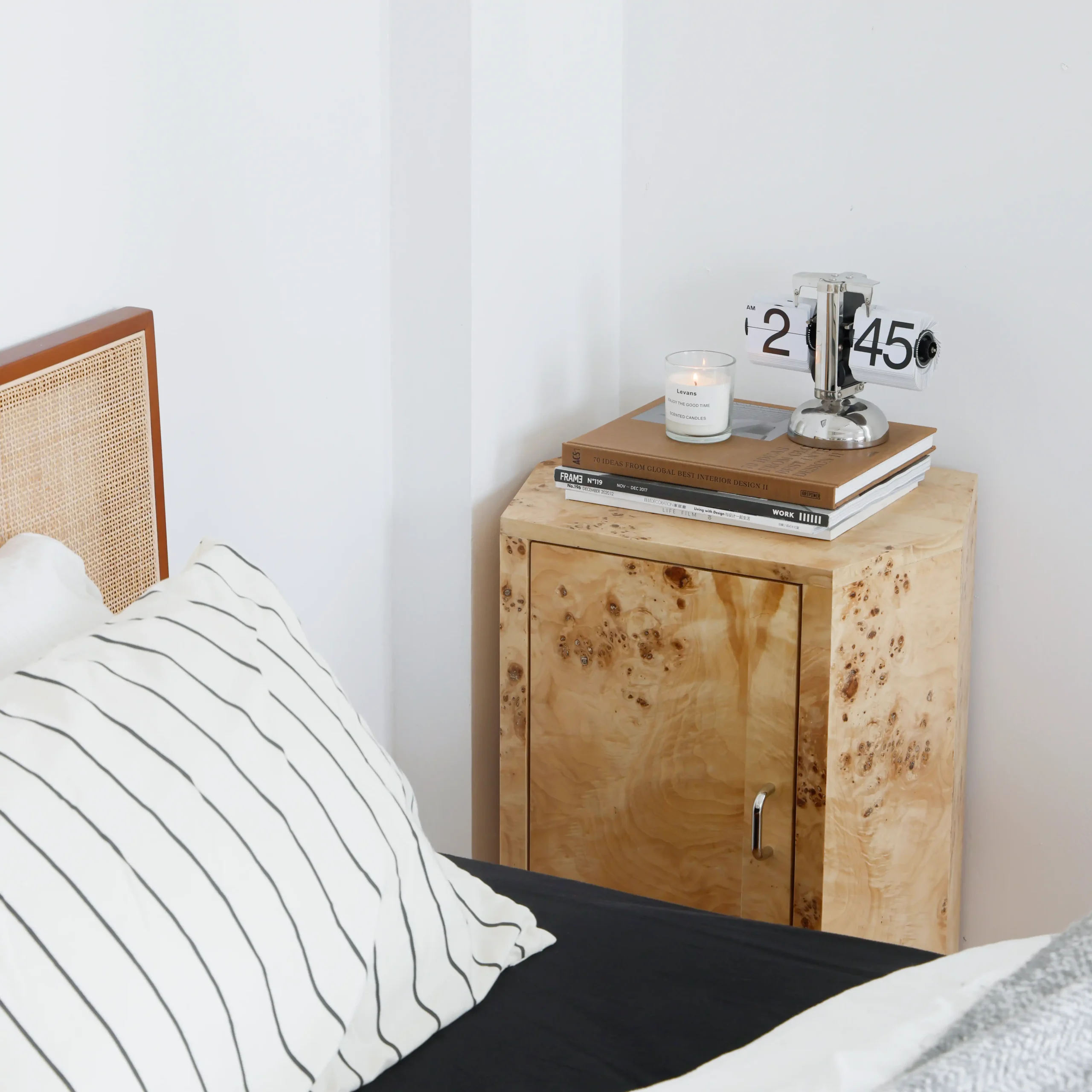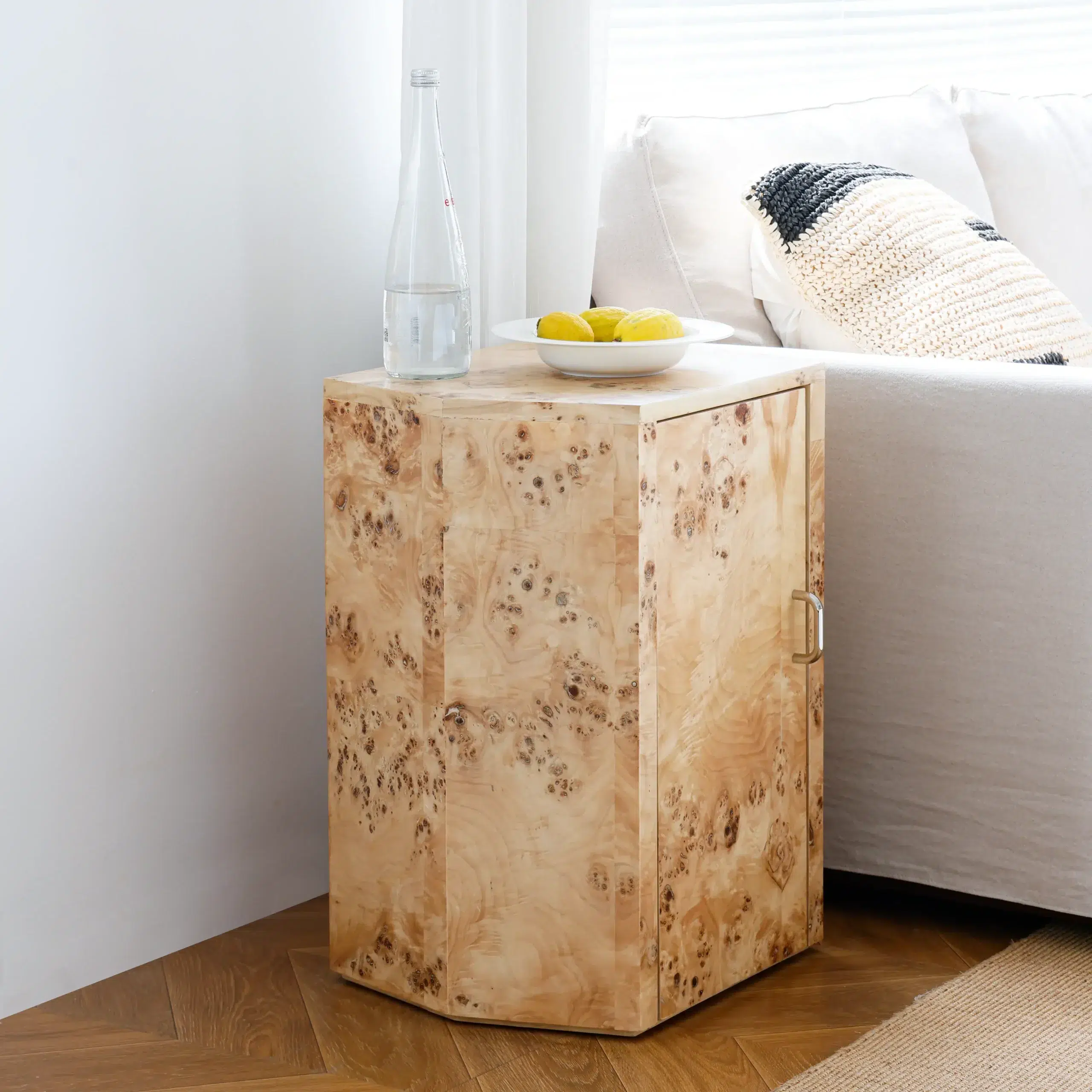 A small hexagonal bedside table that blends natural burl veneer with elegant silver handles for a retro-modern look. Inside, the dual-layer compartment includes removable dividers, making it easy to customise your storage. Finished with water-based paint for safe, durable protection, this piece works beautifully as a bedside table or a compact side table.