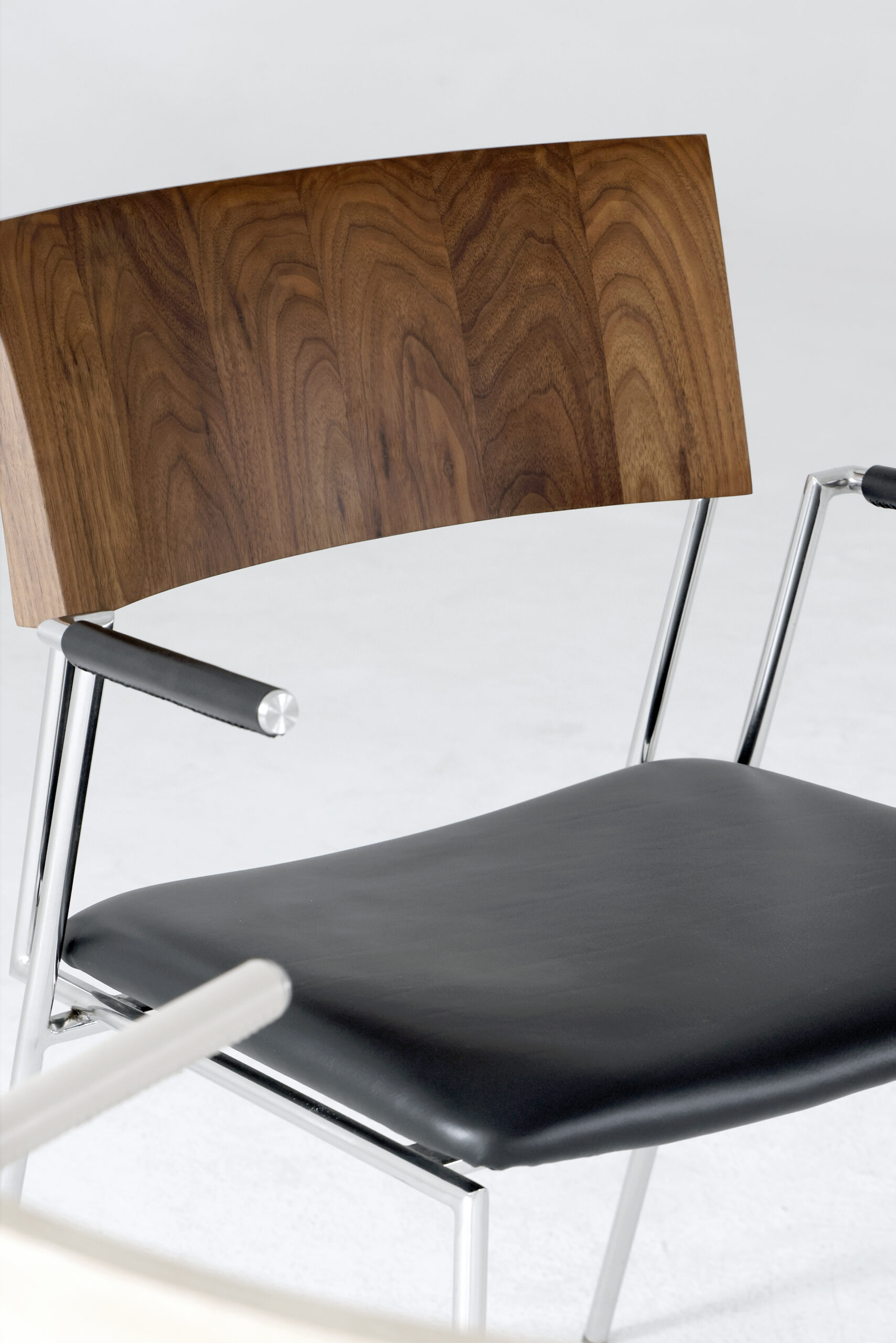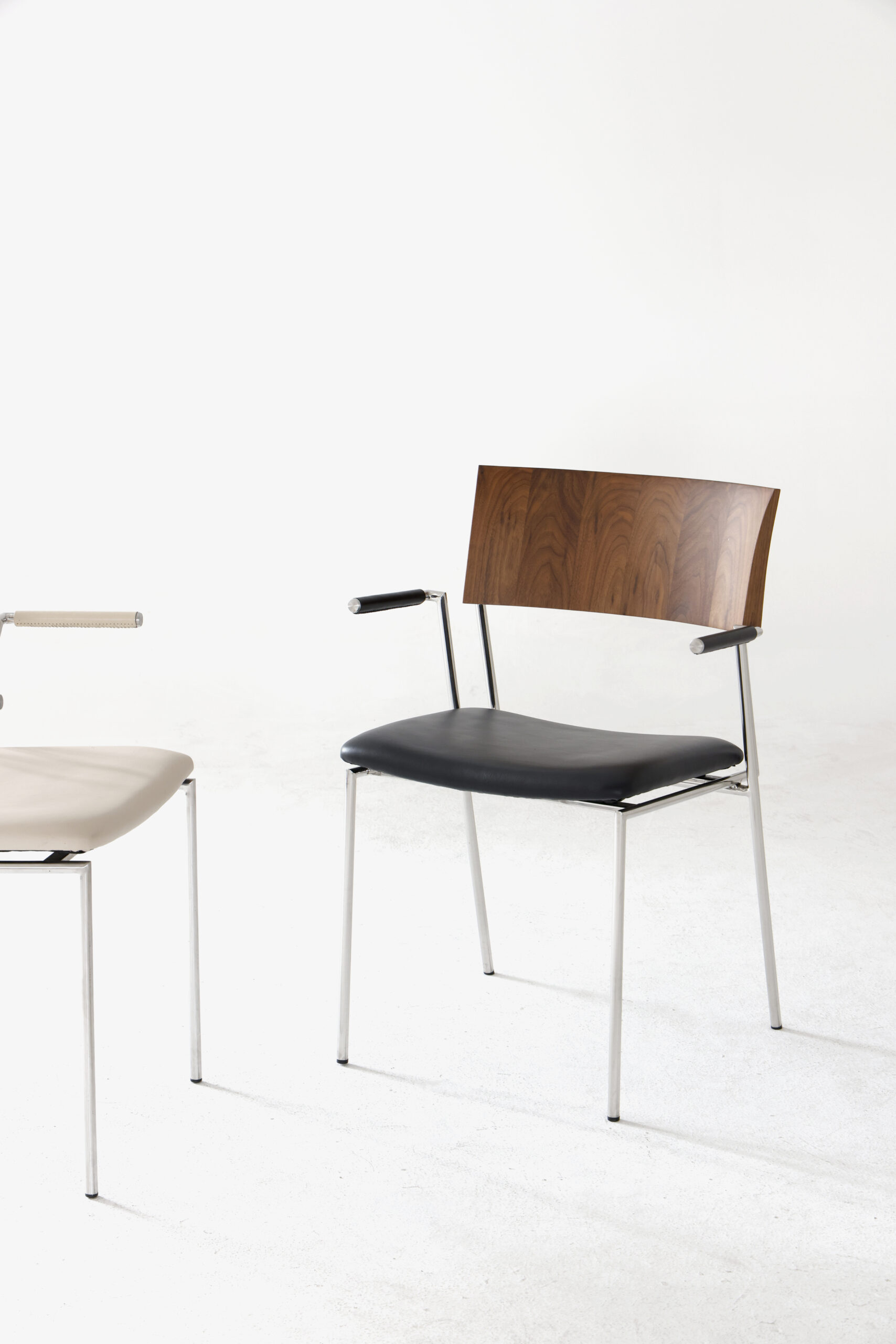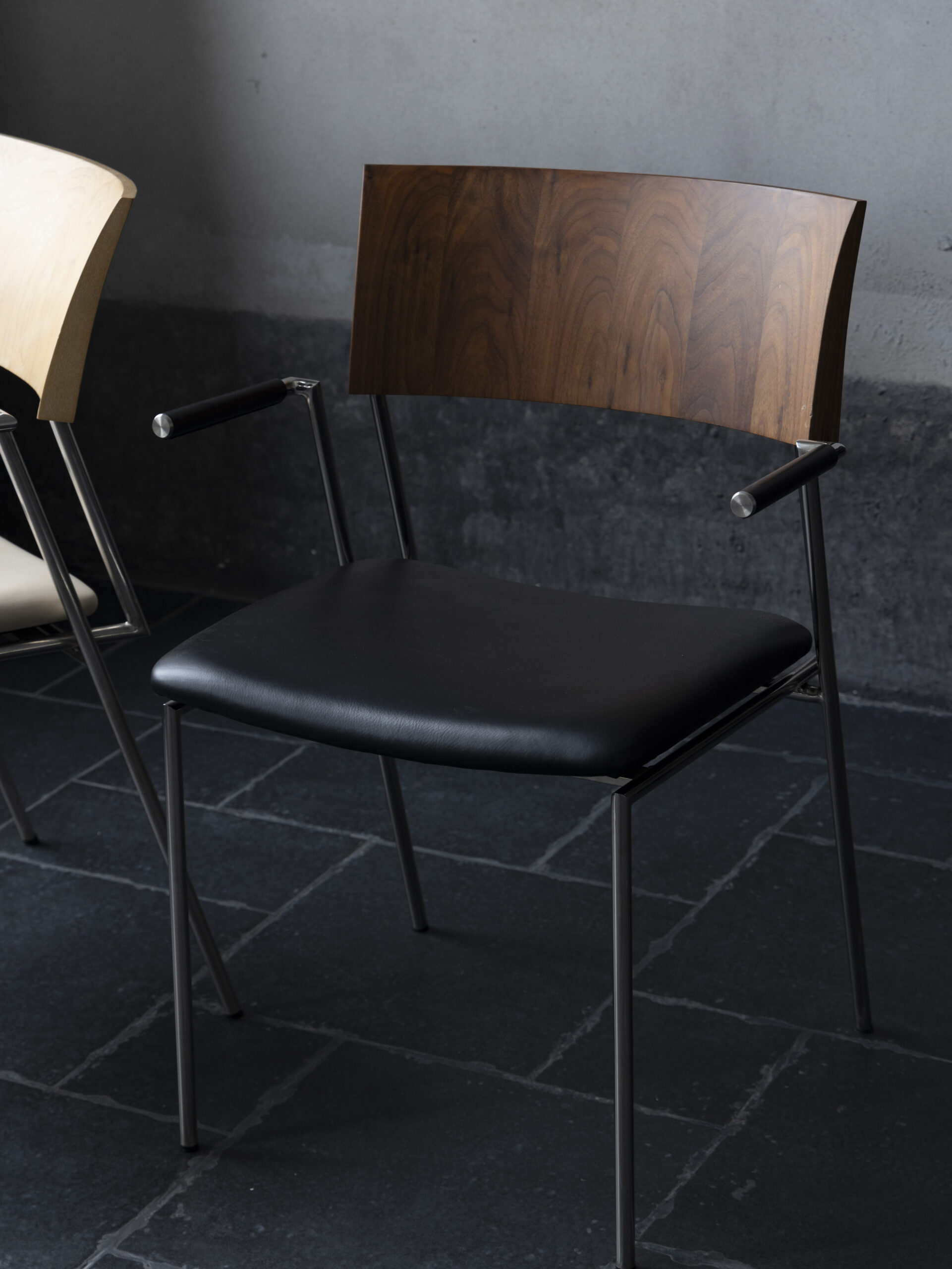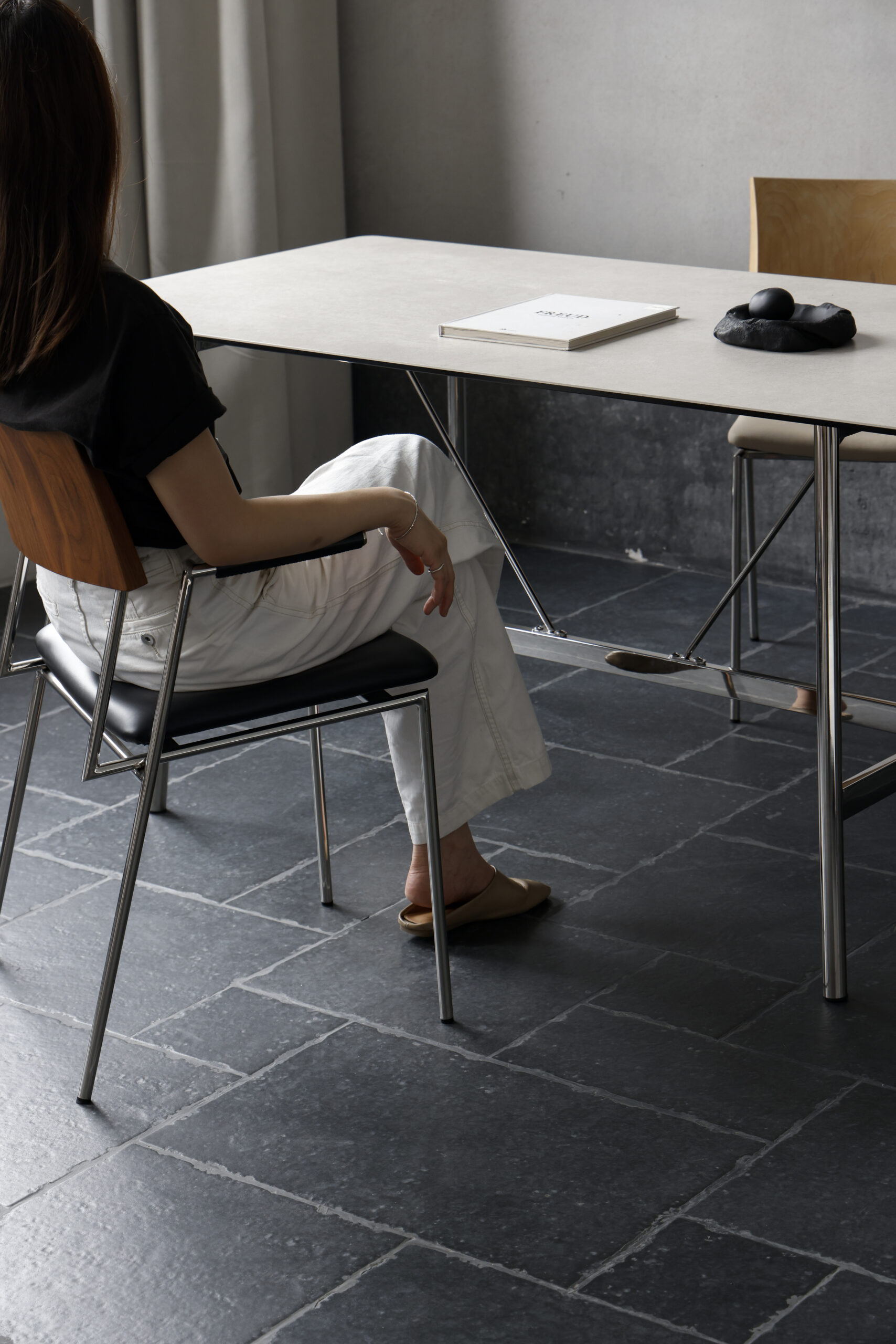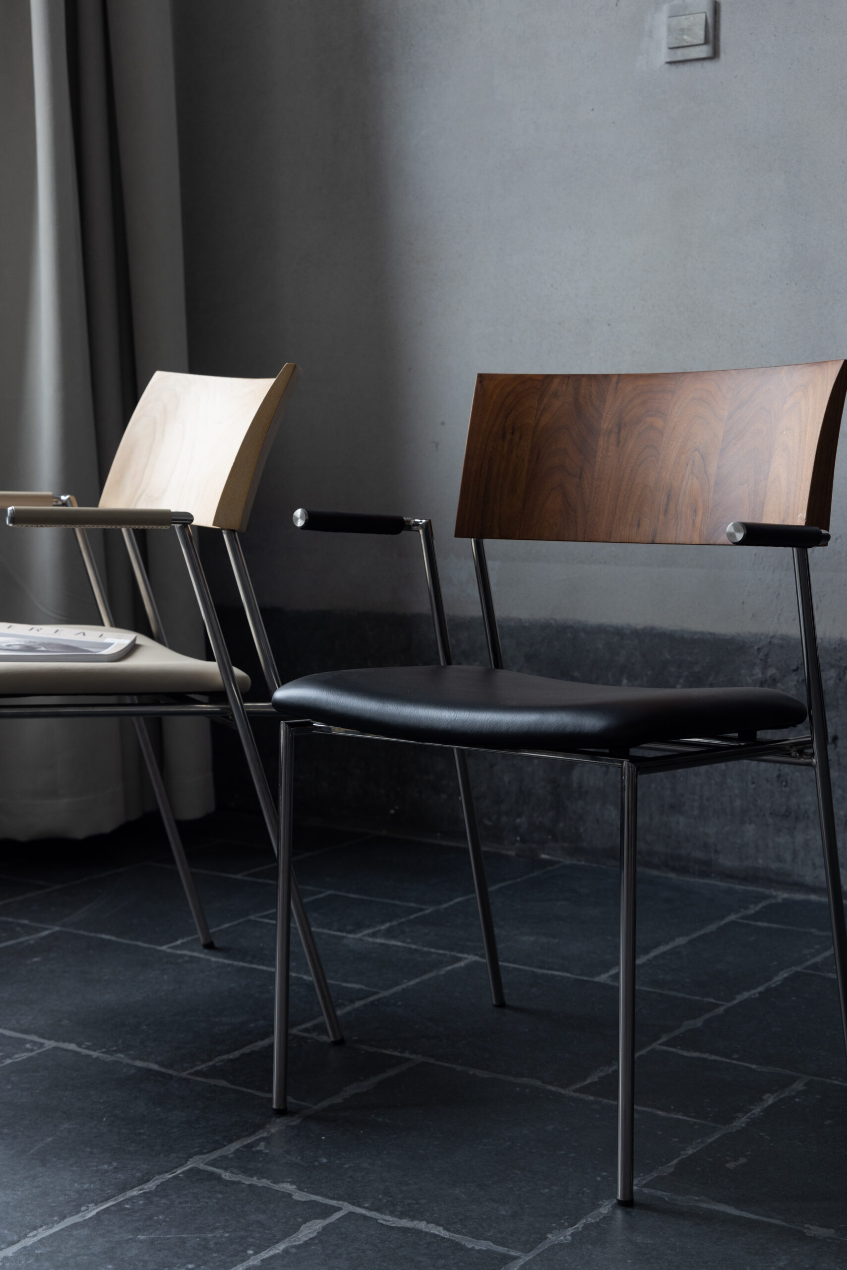 A clean and modern designer dining chair that prioritises comfort. The solid wood backrest brings a natural warmth, while the stainless steel legs add a sleek, minimal touch. Finished with top-grain leather seat cushions, it offers long lasting comfort with a refined, contemporary look.