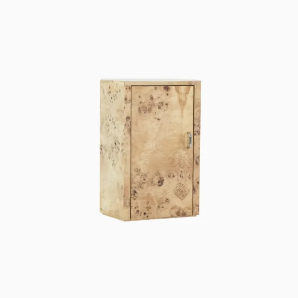 • A small, rectangular wooden cupboard with a single door and a light, natural burr wood finish, featuring a simple metal handle on the right side.A hand places a book on a wooden bedside table with a lantern-style lamp and a glass perfume bottle. Slippers are on the wooden floor next to the bedside table, beside a bed with a grey blanket.